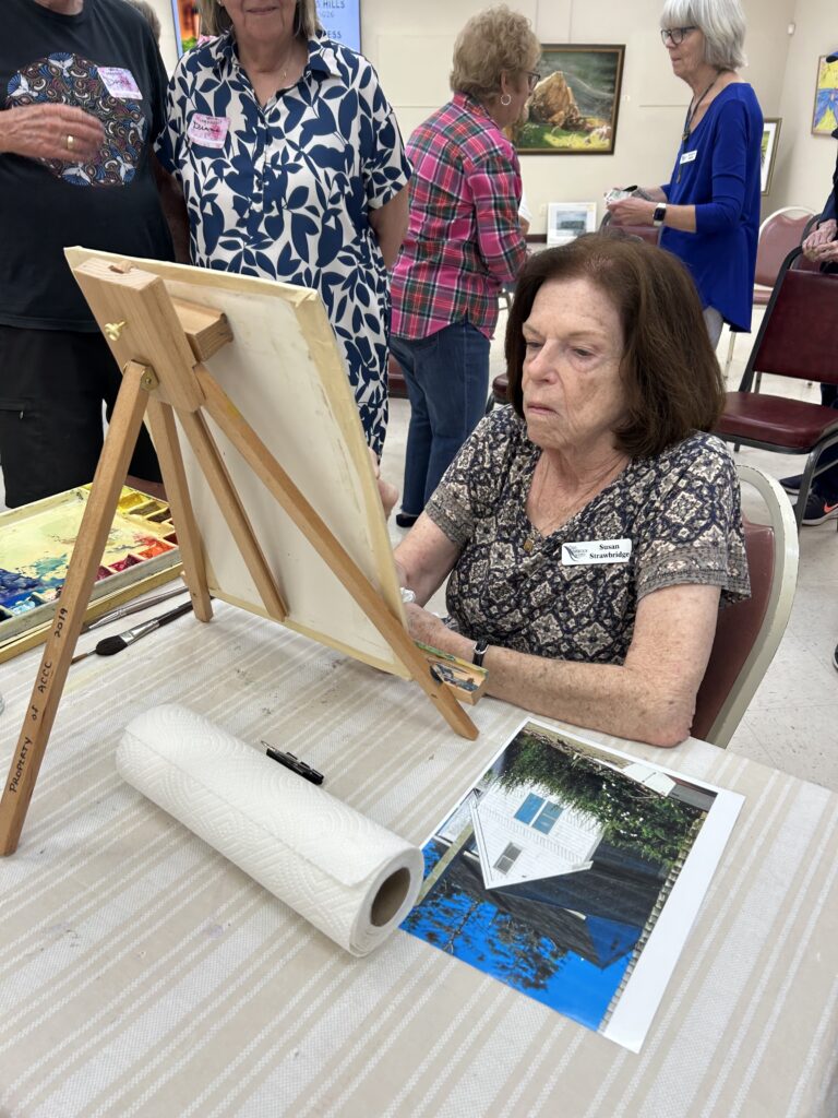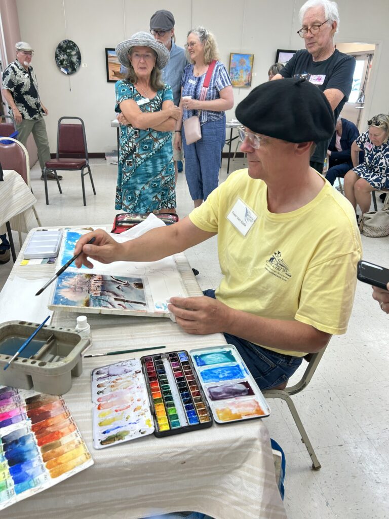 At our April 10 meetingng, five CWS members challenged each other with a “Paint Around”. Our volunteer artist/members (Polly Boston, Dori Sullivan, Theo van Eldik, Lionel Sanchez and Susan Strawbridge) began with their sketch on a half-sheet of watercolor paper. Each artist painted for 10 minutes.  Then that work was passed on to the artist on the right and another 10 minutes are added to each of the paintings, going around in a circle so all five artists add their “magic” to the work presented to them. Each artist has ten minutes to work on each painting. It was a fun time and a gallery of 60 or so members and guests watched the action.